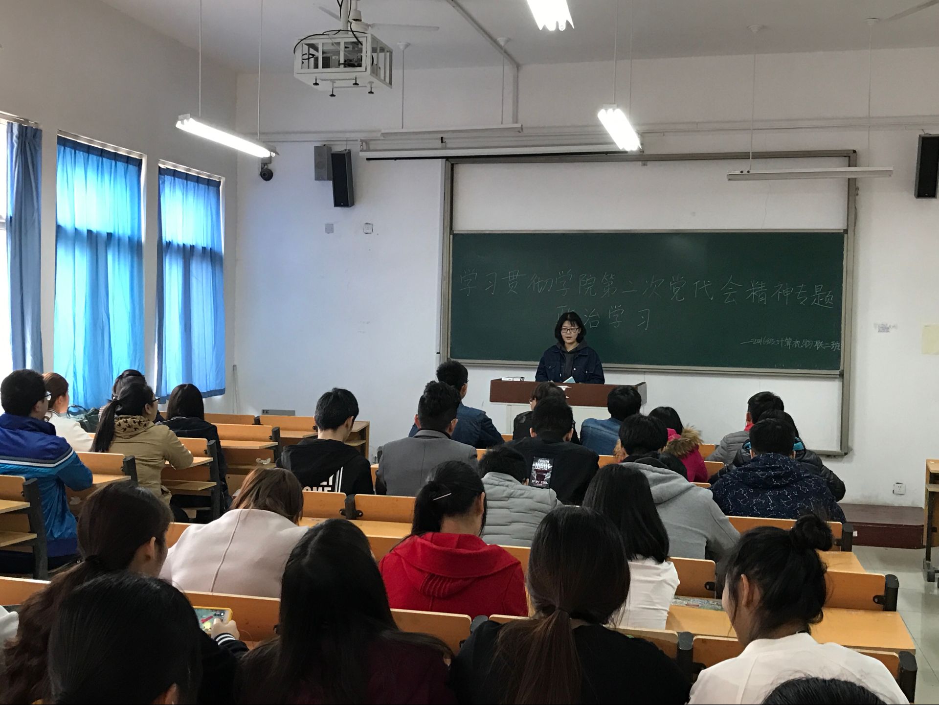 3月23日下午,2016级计算机科学与技术专业(物联网方向)二班在一教B127教室开展了学习贯彻校第二次党代会精神专题政治学习,全体61名同学参加学习活动。政治学习开始后,由团支书宣读了有关学习材料,详细地介绍了我校第二次党代表大会的精神,集中学习了校党委书记王玉华在报告中关于“校情校史教育、团员意识教育、校办学条件的改善与校园文化建设”等方面工作的内容,激励广大团员青年以饱满的热情、良好的状态、优异的成绩向第二次党代表大会的成功召开献礼。
