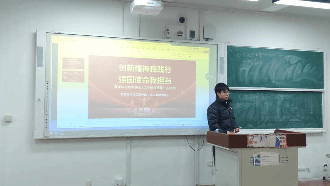 为积极响应国家创新驱动发展战略,深化学生对前沿科技的理解与认同,青年科技创新协会于2025年12月2日举办本学年首次技术分享活动。活动以“创新精神我践行,强国使命我担当”为核心主题,邀请协会社长张思锐担任主讲,围绕人工智能技术发展、行业应用与创新实践展开深度分享,现场氛围热烈,学术交流活跃。