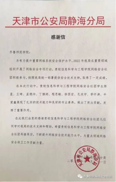 近日,我院网络安全社团收到天津市公安局静海分局发来的感谢信,天津市公安局静海分局对我院网络安全社团在其“2022重要网络安全领域的网络安全专项行动”所提供的网络安全技术支撑工作和帮助以及取得的成绩表示认可和感谢。