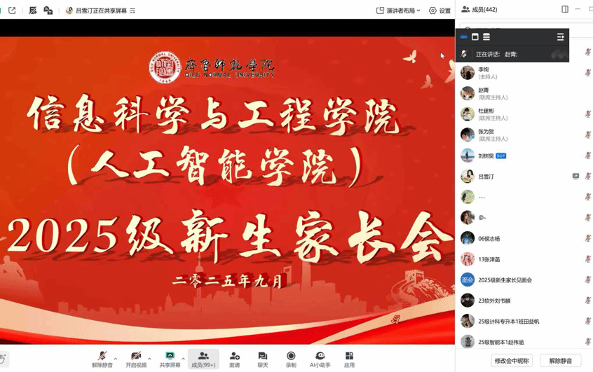 为深入贯彻落实立德树人根本任务,切实加强家校协同育人,信息科学与工程学院(人工智能学院)于2025年9月12日召开2025级新生家长线上见面会。学院党委书记赵青、院长杜建彬、党委副书记姜麒麟、副院长秦超、副院长梁振明、学院团总支、办公室工作人员、2025级新生班主任、辅导员及全体新生家长参加会议。会议由学院团总支书记李绚主持。