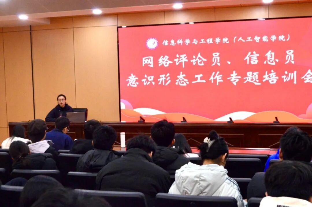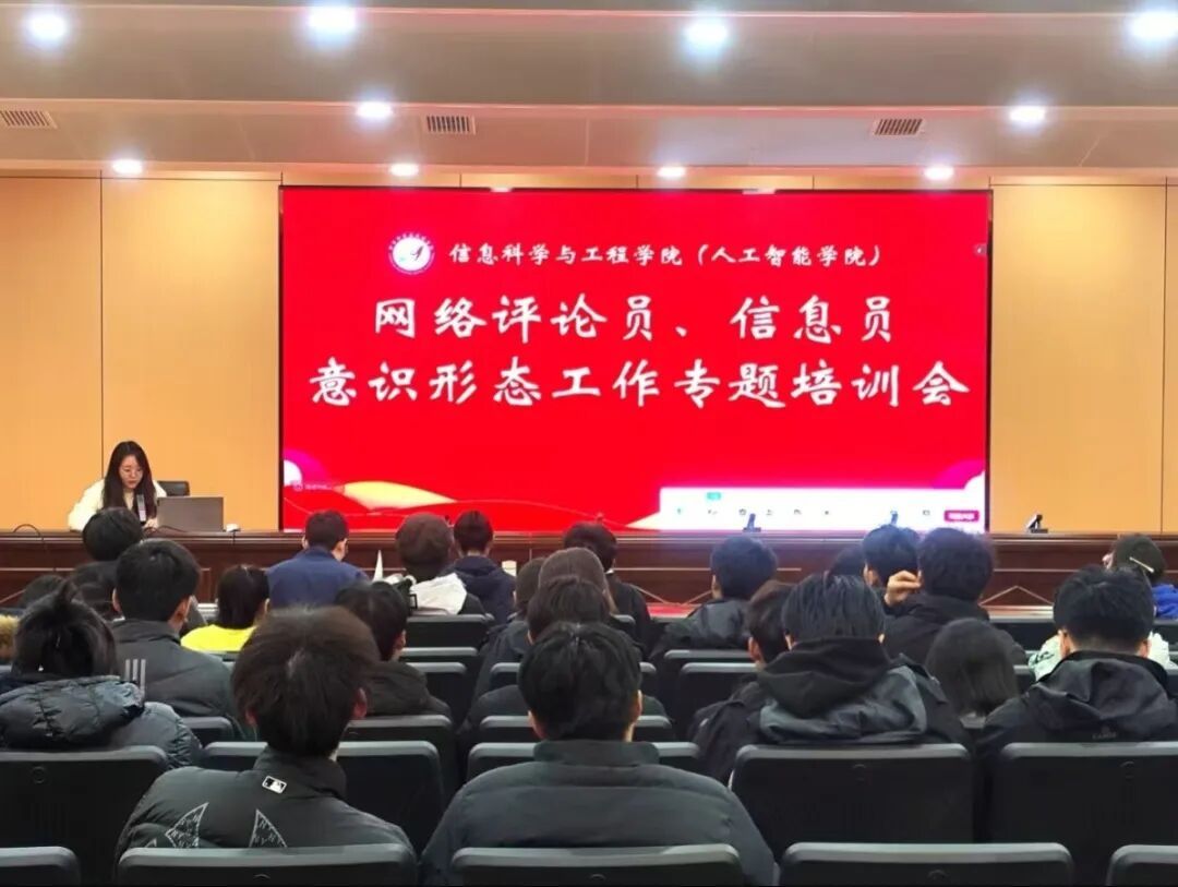 为筑牢校园网络安全防线,强化学院网络意识形态工作队伍专业化建设,全面提升网络评论员、信息员的政治素养与业务实操能力,11月27日,信息科学与工程学院(人工智能学院)召开网络评论员、信息员意识形态工作专题培训会。学院党委书记赵青、党委副书记姜麒麟出席会议,学院全体网络评论员与信息员共同参会。会议由团总支副书记李瑶主持。
