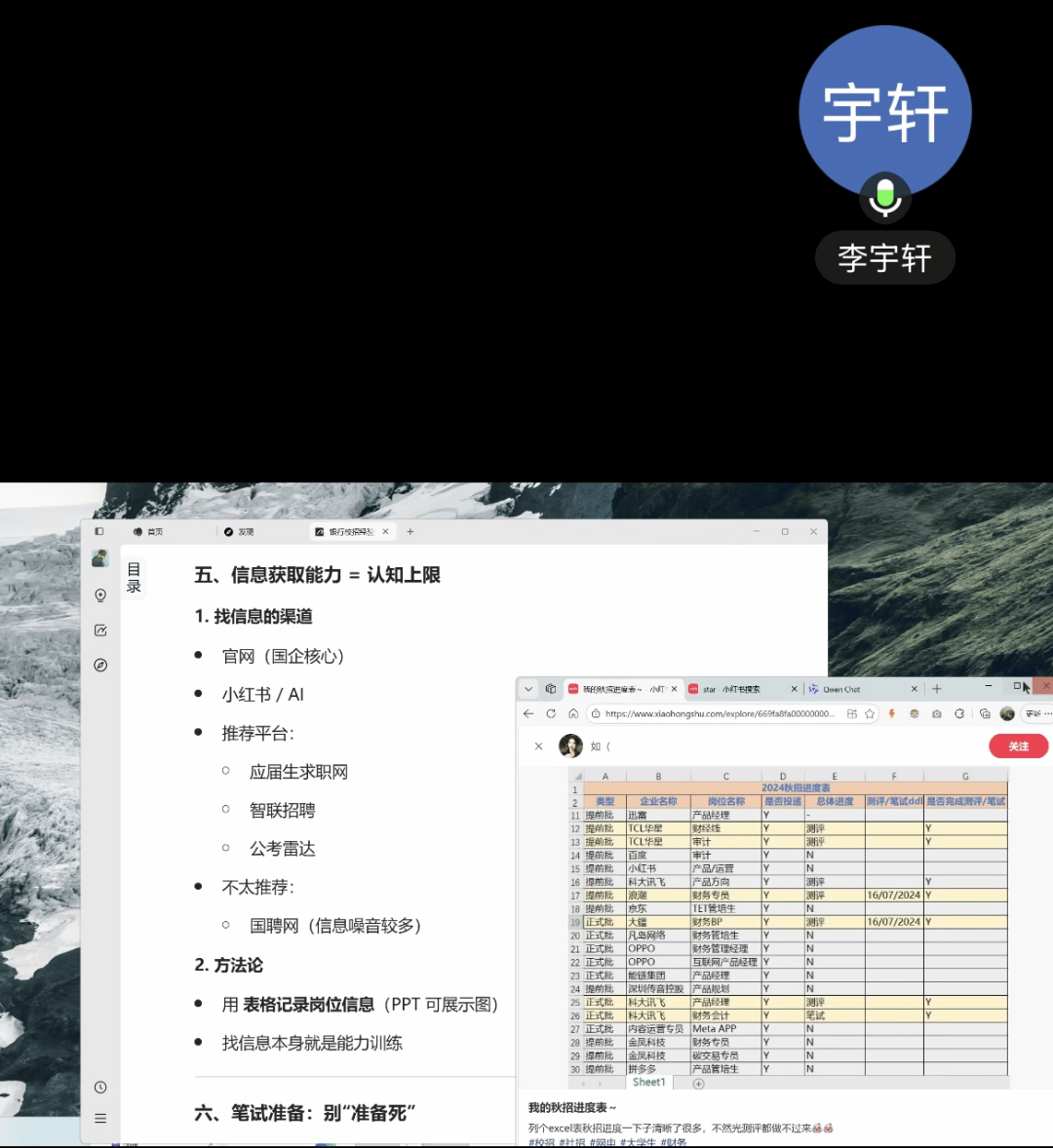 李宇轩则将重心放在笔试备考环节,对银行笔试核心考查模块展开深度解析。他围绕 EPI(通用就业素质测评)、英语、综合知识等科目,结合历年真题讲解言语理解、数字运算、逻辑推理等题型的解题思路与答题技巧,还分享了行测备考资料的整理方法,为同学们搭建高效的笔试复习框架。同时,他提醒大家要密切关注时政热点,提前