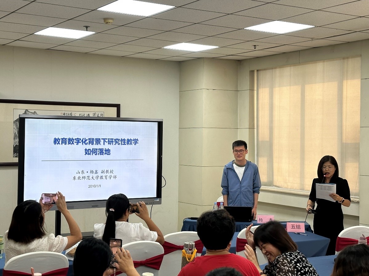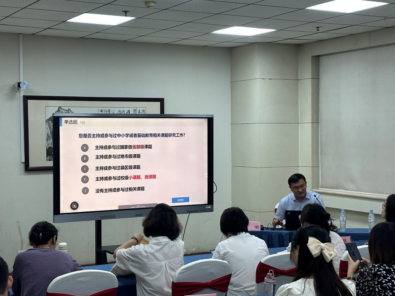 东北师范⼤学教育学部杨鑫副教授作讲座《教育数字化背景下研究性教学如何落地》,讲述综合实践活动课程来源于对现实问题的思考,强调数字化技术与问题相对应的重要性,并以案例式教学方式现场说法,让参训教师理解“以问题和需求”达成教学目标的重要性,也感受到数字化教学的科学价值。