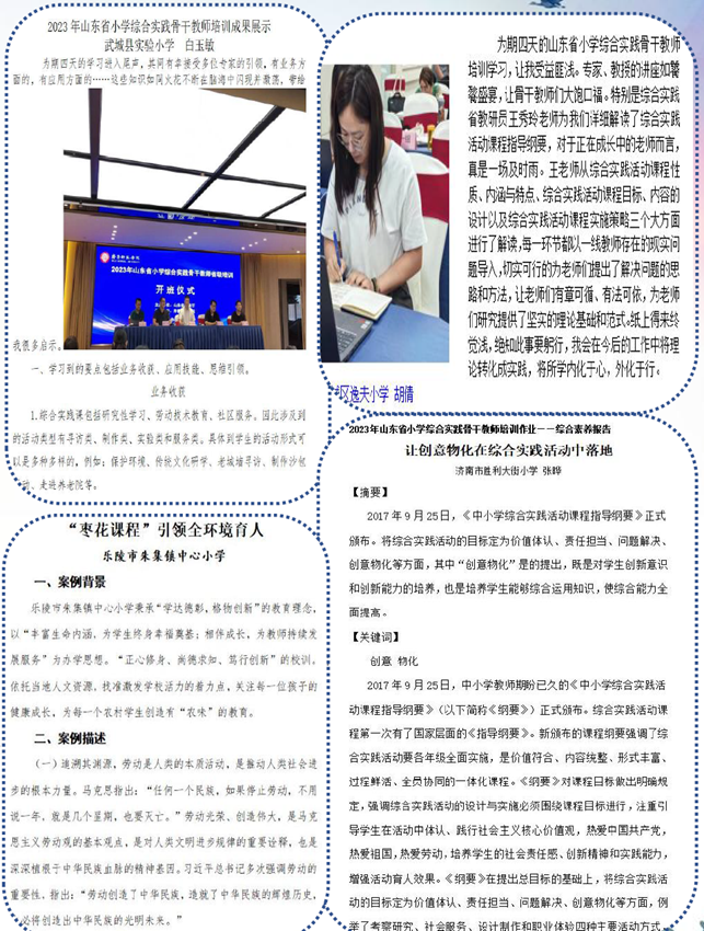 全体参训教师实地考察了济南市新世界小学,学校立足走“专家督导、科研兴校、特色立校”之路,创设“博、雅、翔”的校园文化氛围以“自主、情趣、高效”的课堂文化为学校发展的核心竞争力。韩同旺校长展示了《交通安全伴我行》示范课,浙大数字出版研究中心课程教材研究所的吕志新老师进行了《从新课堂向新出发》的精彩分享。