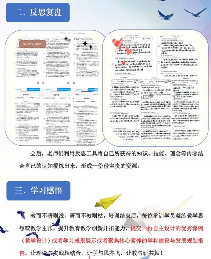 为期五天的培训是一面面的专家引领、一场场的头脑风暴和一次次的同行交流,参训教师们高涨的学习热情反映了真挚的教育情怀,并通过学习笔记、反思复盘和学习感悟的形式总结了学习收获和工作反思。