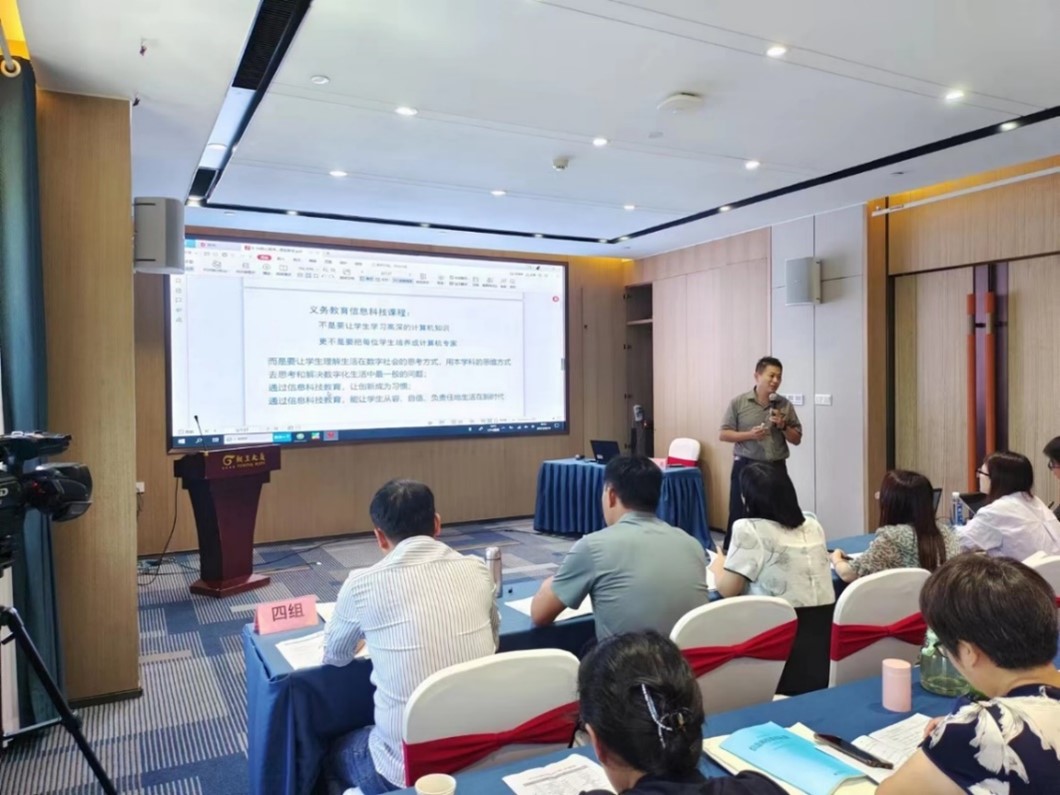 山东省教育科学研究院的赵亮教授作为学科省教研员解读了义务教育信息科技课程标准,通过报告《从怎么看到怎么办——核心素养、新课标、课堂教学》深入浅出地为教师们指明了基于信息科技核心素养的课程建设方向,并指导参训教师们共同研讨了开展跨域协同教研的山东实践。