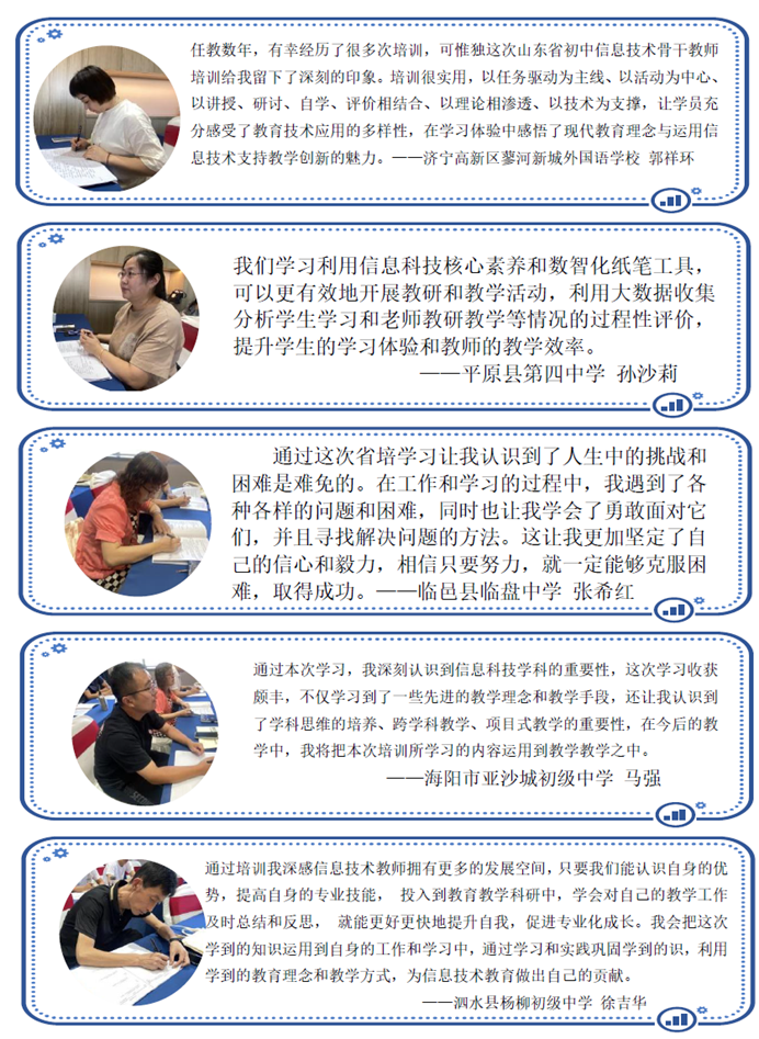 为期五天的培训是一面面的专家引领、一场场的头脑风暴和一次次的同行交流,参训教师们高涨的学习热情反映了真挚的教育情怀,并通过学习笔记、反思复盘和学习感悟的形式总结了学习收获和工作反思。