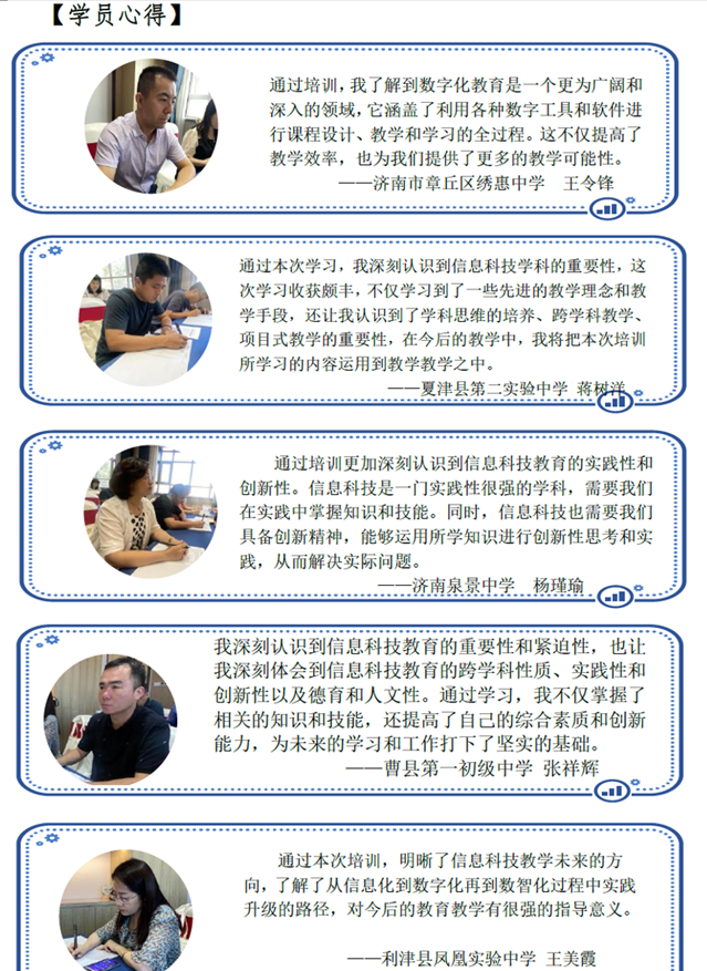 培训期间,由高校学者、省市教研员和齐鲁名师名校长组成的专家团队与各学科骨干教师共话教育、共谋学科发展。通过团建破冰、教育考察、结构化研讨、精准课堂观察、跨学科项目实训、教育成果培育等活动营造了良好的学科发展生态,也为今后的跨域协同教研奠定了稳定的团队基础和平台支撑。