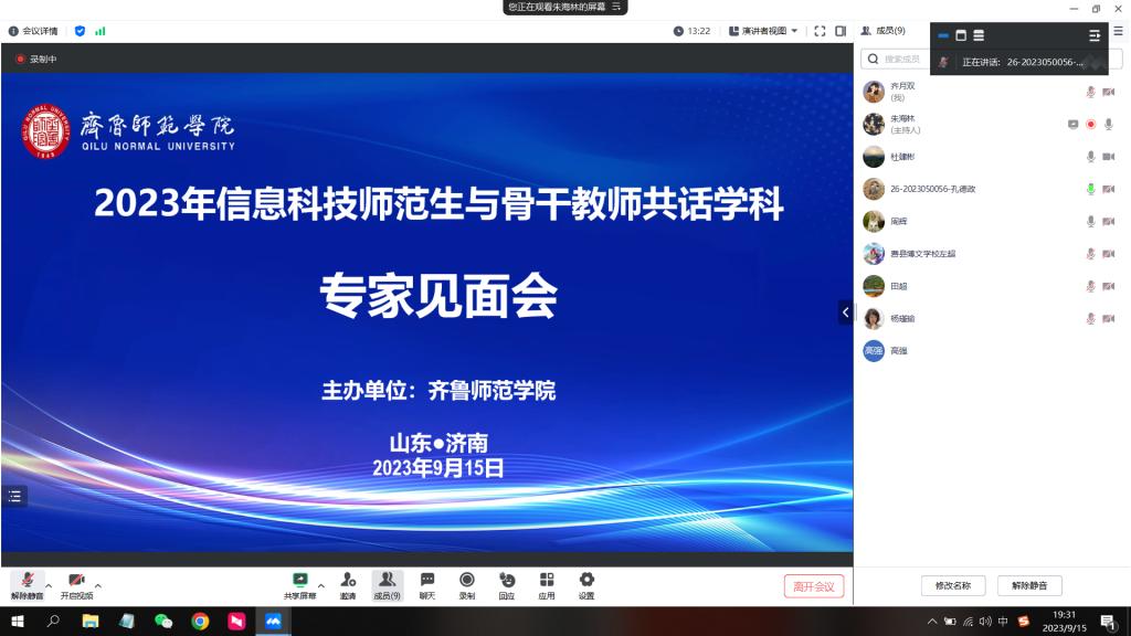 为提升计算机科学与技术专业师范生的教师专业能力素养,充分利用我院“省培计划”资源,促进师范生职前职后一体化培养,2023年9月15日,信息科学与工程学院举办了“信息科技师范生与骨干教师共话学科”专家见面活动,邀请参加省级骨干教师培训的一线教师与师范生进行线上交流答疑。骨干教师代表栖霞市教学研究室田超、济南泉景中学杨瑾瑜、兰陵县实验中学周辉、烟台港城中学高强、费县博文学校左超、信息科学与工程学院院长杜建彬、齐月双、袁雪及21级公费师范生参加了本次会议。会议由袁雪主持。