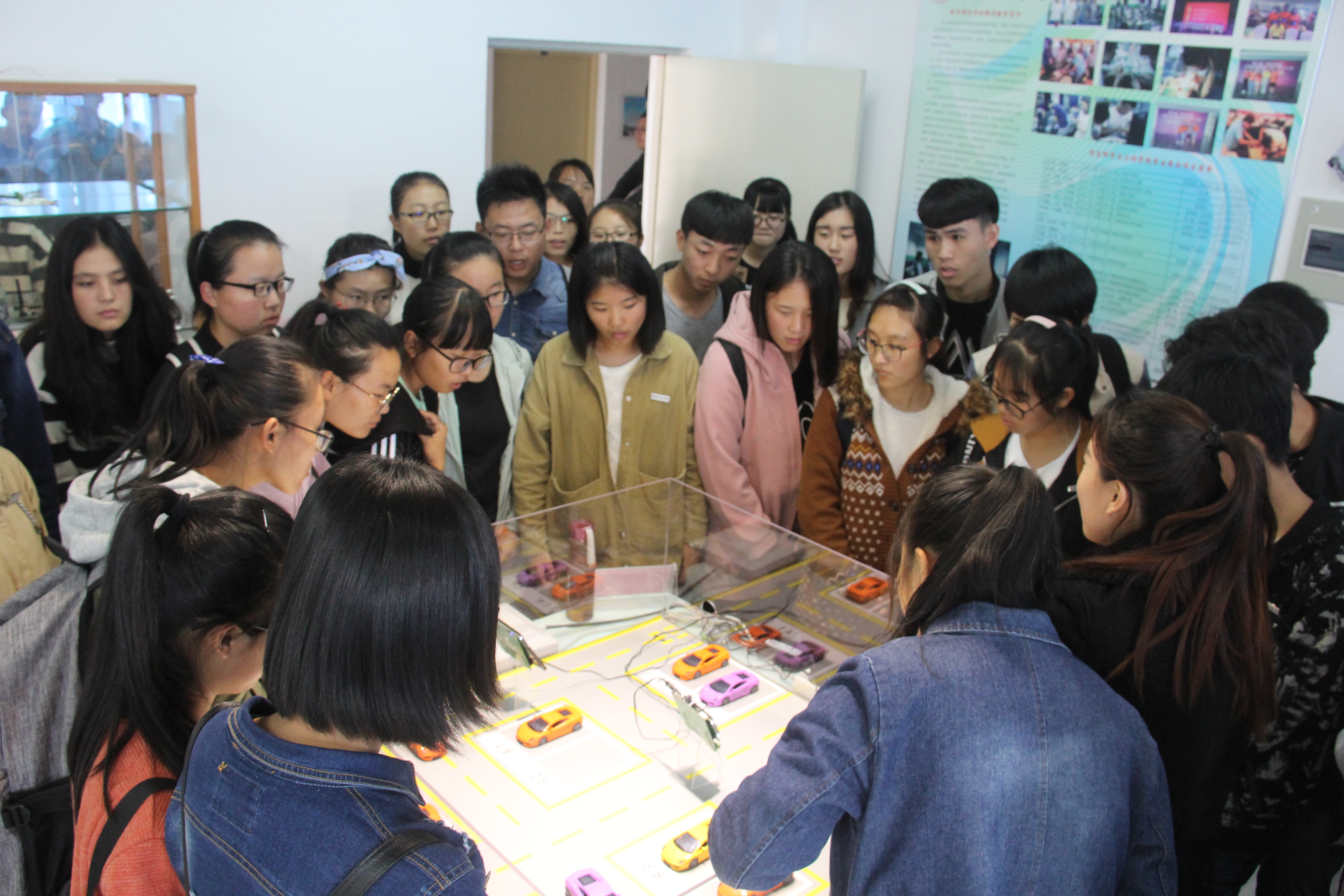 图为:10月12日,学院国家级科技创新竞赛项目参赛队员邀请新生科技创新社团全体新成员参观学院的“电子设计与创新实验室”。