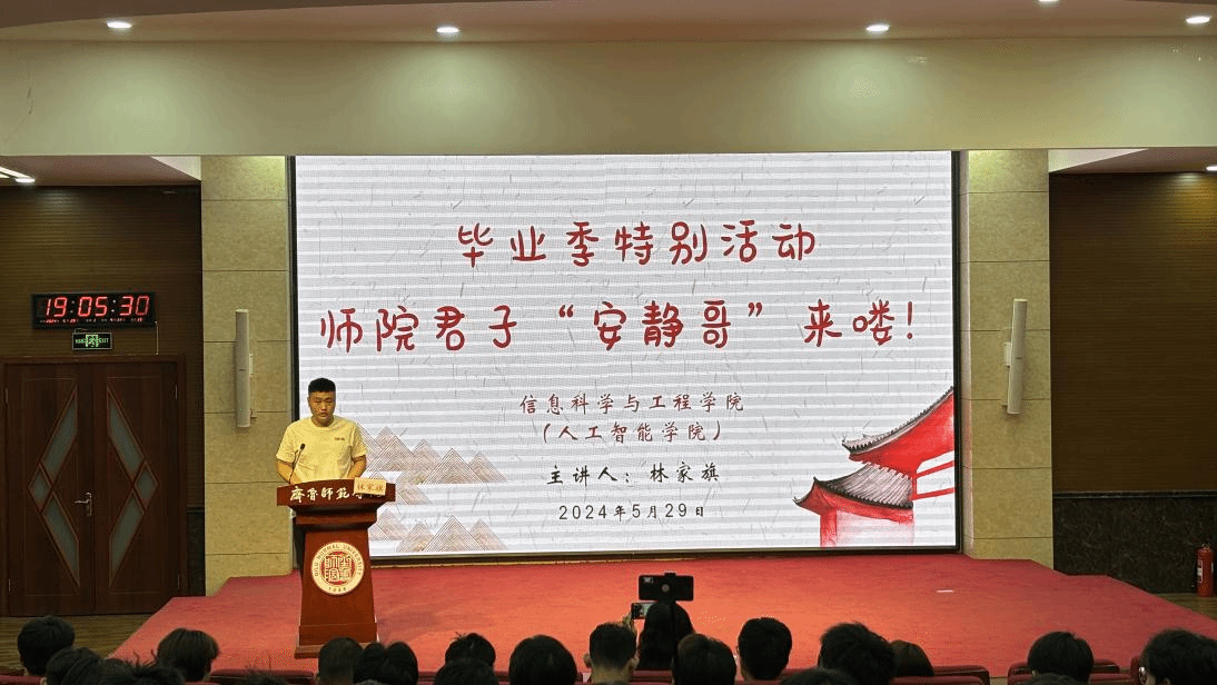 为切实落实 OBE理念,营造学君子、做君子的校园文化氛围,5月29日,信息科学与工程学院(人工智能学院)邀请2024届毕业生“安静哥”林家旗,在章丘校区第一学术报告厅开展“榜样力量 君子学堂”君子文化分享交流会。学院党委书记赵青、辅导员老师及2023级同学参与此次活动。