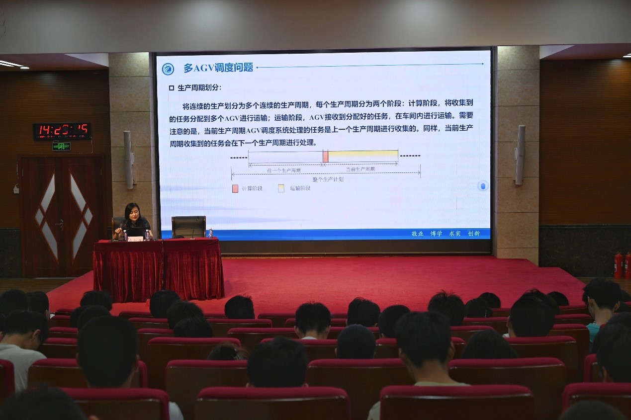 报告会上,桑红燕详细阐述智能优化的理论方法与应用,并系统介绍了智能制造领域存在的分布式置换流水车间调度、AGV调度、AGV与并行机联合调度等问题,以及相应的进化优化算法。