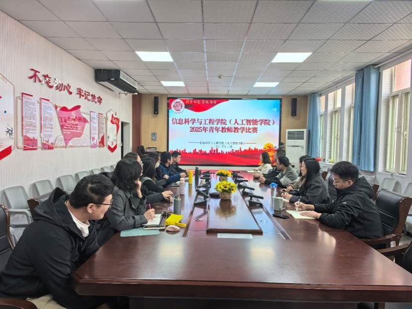 为深入学习贯彻习近平新时代中国特色社会主义思想,落实全国教育大会精神及中共中央、国务院《关于全面深化新时代教师队伍建设改革的意见》要求,培育高素质、专业化、创新型教师队伍,2025年10月23日下午14:00,信息科学与工程学院(人工智能学院)举办2025年青年教师教学比赛展示交流活动,学院院长杜建彬、副院长秦超、副院长梁振明、各教研室主任、各专业负责人、青年教师参加了活动。
