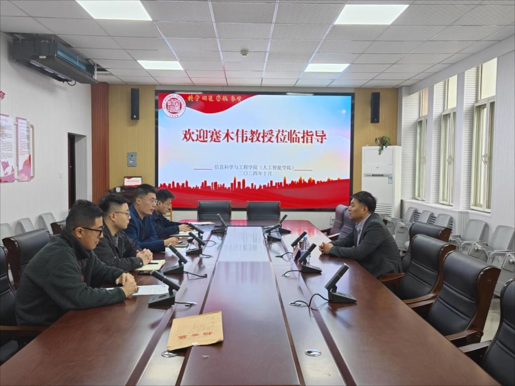 为加强学院学术交流,拓宽师生的学术视野,提高学院科研水平,10月22日上午,山东财经大学二级教授、博士生导师,山东省科技进步二等奖、山东省子软科学二等奖、山东省人工智能科技奖自然科学一等奖获得者蹇木伟受邀到信息科学与工程学院(人工智能学院)交流访问。信息科学与工程学院(人工智能学院)院长杜建彬、办公室主任刘树昊、青年博士张健铖、梁振明参加座谈。会议由杜建彬主持。