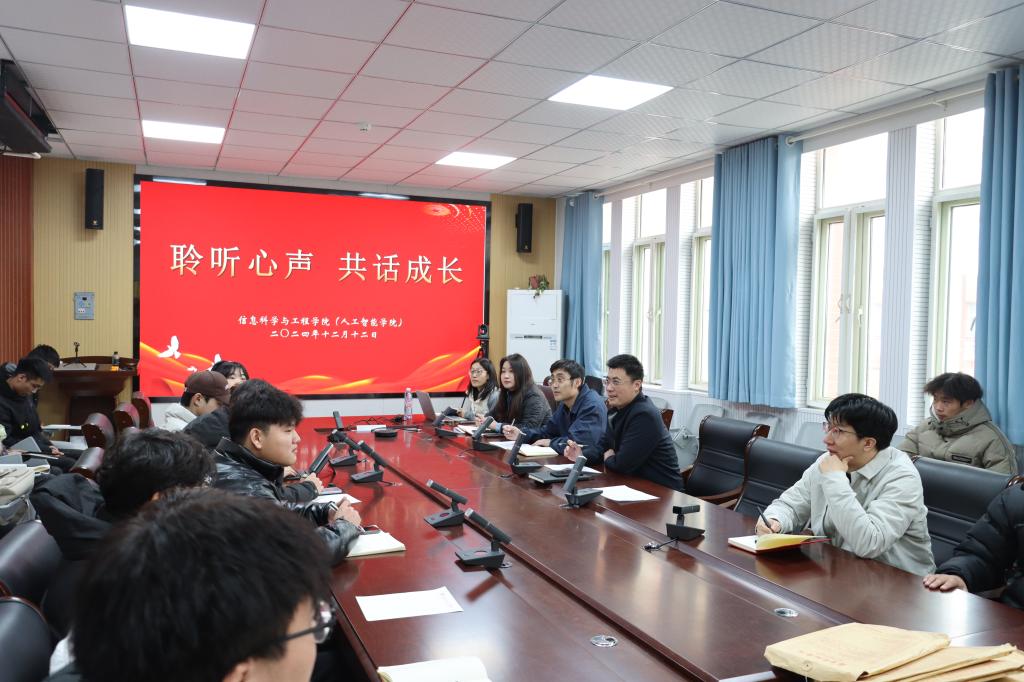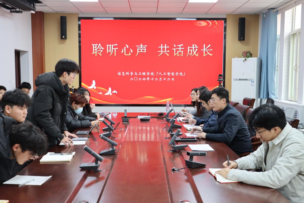 为深入了解学生思想动态和学习生活情况,倾听学生心声,做好学生的培养和服务,全方位助力学生成长成才,12月12日,信息科学与工程学院(人工智能学院)举行新生代表座谈会,学院院长杜建彬、党委副书记姜麒麟、辅导员老师及2024级新生代表参加,团总支书记李绚主持会议。