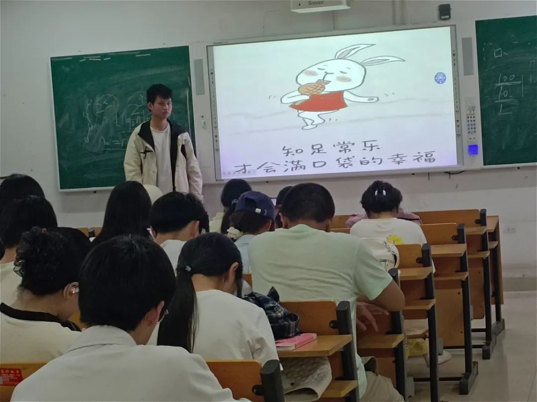 最后,宣讲团介绍了收获满足状态。收获满足状态,恰似在心灵原野上遇见一片静谧的湖泊。积极心理学中的正念练习如同拂过湖面的清风,驱散杂念的涟漪,让内心归于澄澈;自我接纳理论则是湖底坚实的河床,承载着所有的不完美,给予心灵安稳的依托。当我们运用情绪ABC理论调节认知,就像为湖泊架起堤坝,合理疏导欲望的洪流,不让过度的渴求泛滥成灾。此刻,满足不再是遥不可及的山巅,而是湖边绽放的野花,是倒映在水中的星辰。我们以平和之心驻足湖畔,在觉察与接纳中,聆听内心的低语,真正领悟“知足”的真谛,让心灵浸润在这份安宁与丰盈之中。