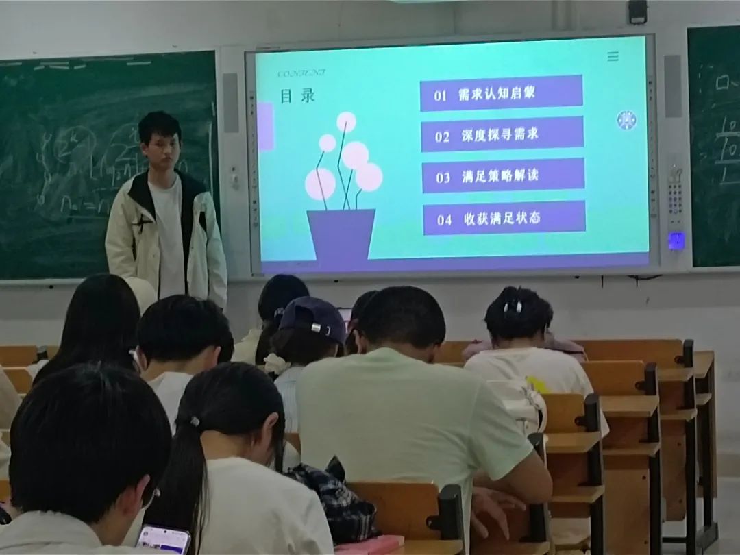 宣讲团本次的宣讲主题是洞察需求,心满意足。宣讲团从四个方面为同学们讲解,分别是需求认知启蒙,深度探寻需求,满足策略解读,收获满足状态。