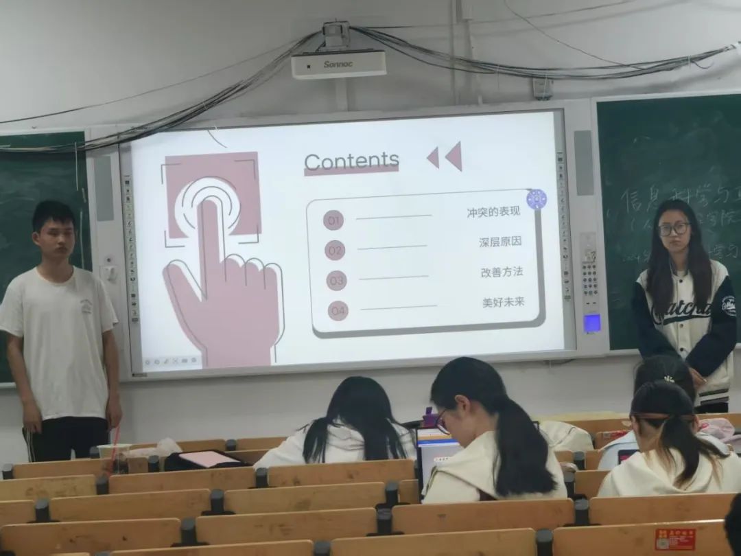 宣讲团本次的宣讲主题是缓心适律,谐步生光。宣讲团从四个方面为同学们讲解,分别是冲突的表现,深度原因,改善方法,美好未来。