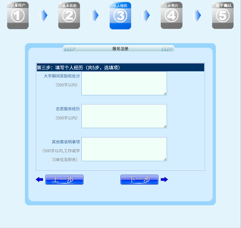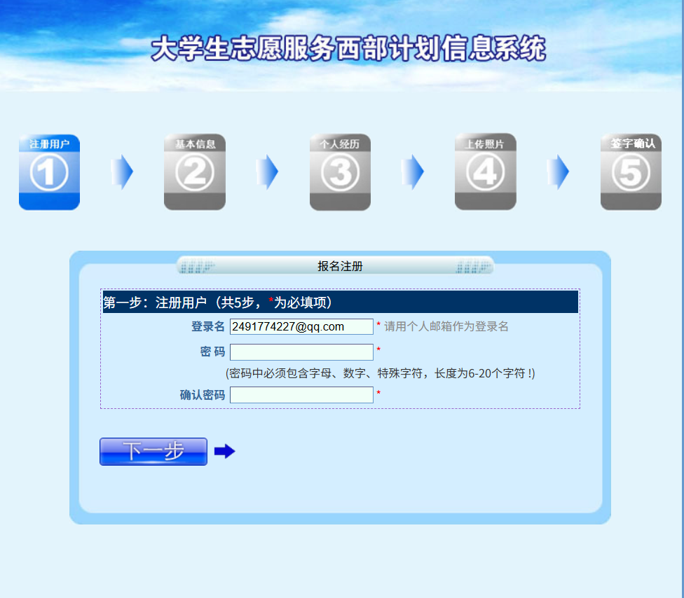 6、认真填写基本信息,填写完毕后点击“下一步”。