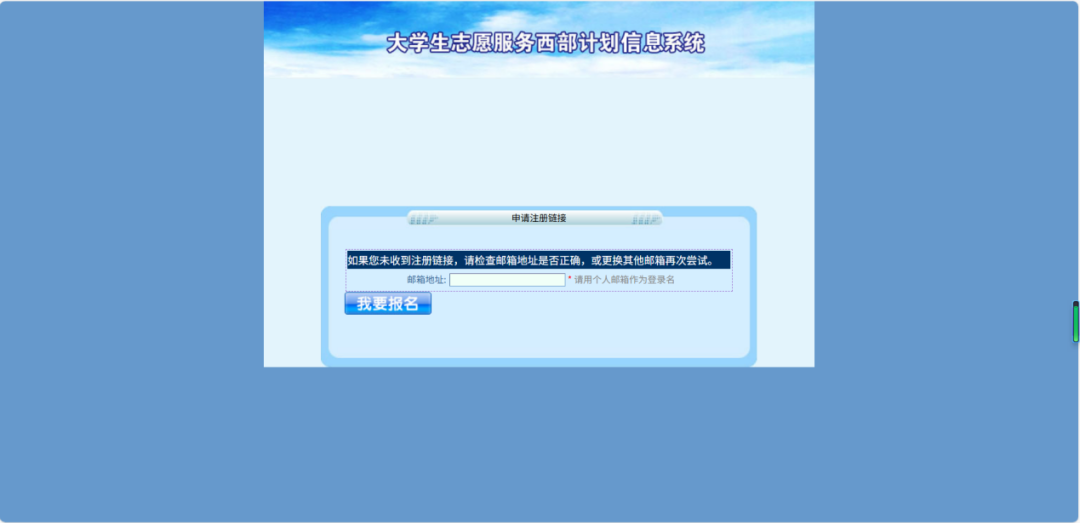 1、登录西部计划官网(http://xibu.youth.cn)点击首页右侧的“西部计划报名系统”。