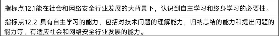 12.[终身学习]:具有自主学习和终身学习的意识,有不断学习、持续提高、适应社会和网络安全行业发展的能力。