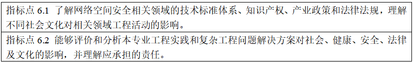 6.[工程与社会]:能够基于网络空间安全工程相关背景知识进行合理分析,评价专业工程实践和网络空间安全工程领域复杂工程问题解决方案对社会、健康、安全、法律以及文化的影响,并理解应承担的责任,了解国家在网络空间安全领域的法律法规,具有良好的法律素养,在从事职业过程中能遵守相关的法律法规要求。