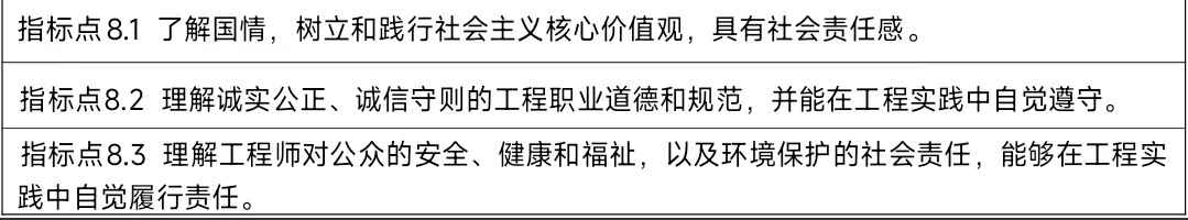 8.[职业规范]:具有人文社会科学素养、社会责任感,能够在网络空间安全工程实践中理解并遵守工程职业道德和规范,履行责任。