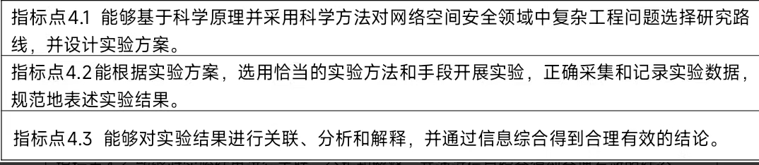 4.[研究]:能够基于科学原理并采用科学方法对网络空间安全工程领域复杂工程问题进行研究,包括设计实验、分析与解释数据、并通过信息综合得到合理有效的结论。
