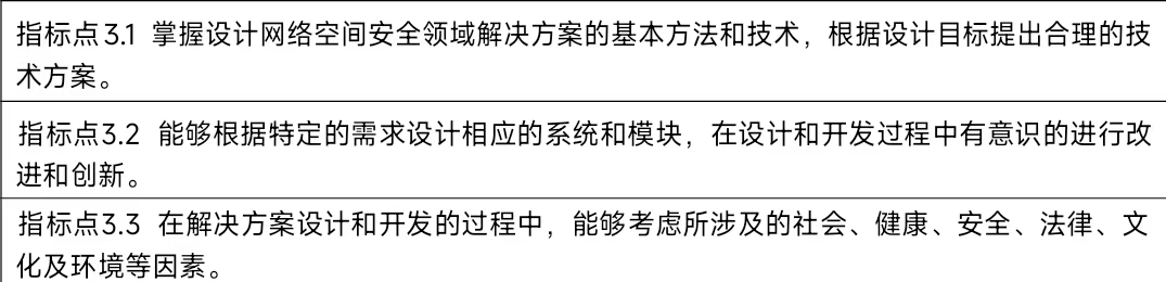 3.[设计开发]:能够综合运用理论和技术手段,设计针对网络空间安全工程领域复杂工程问题的解决方案,设计和开发满足信息真实性、完整性、机密性、可用性等需求的系统、单元(部件)或流程,并能够在设计和开发环节中体现创新意识,考虑社会、健康、安全、法律、文化以及环境等因素。
