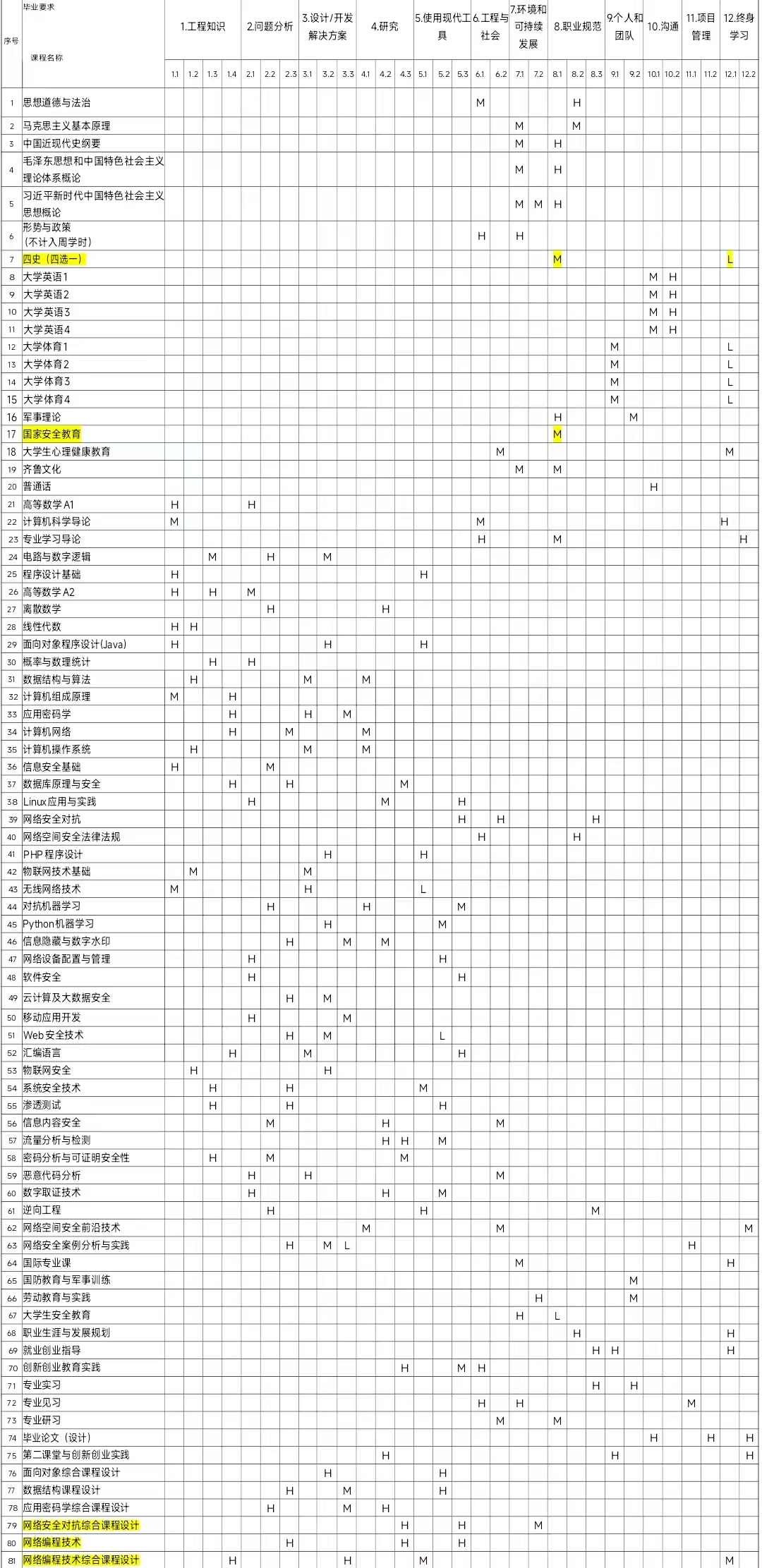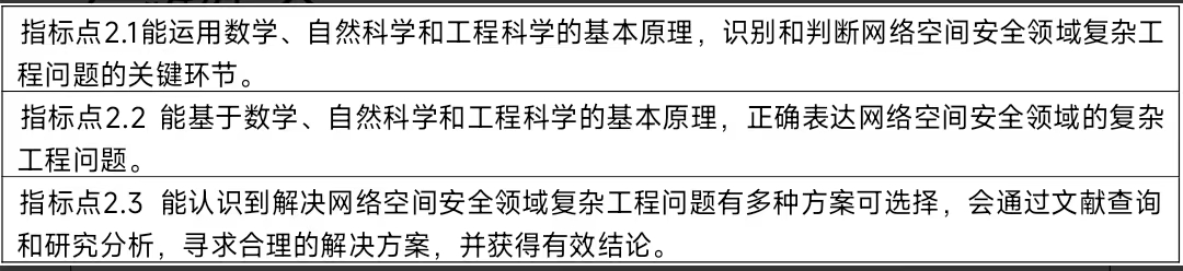 1.[工程知识]:具有从事网络空间安全工程所需的扎实的数学、自然科学、人文社会科学和工程技术理论基础,具有密码学、系统安全、网络安全、应用安全、信息内容安全等领域的系统的专业知识,具有解决网络空间安全复杂工程问题的能力。