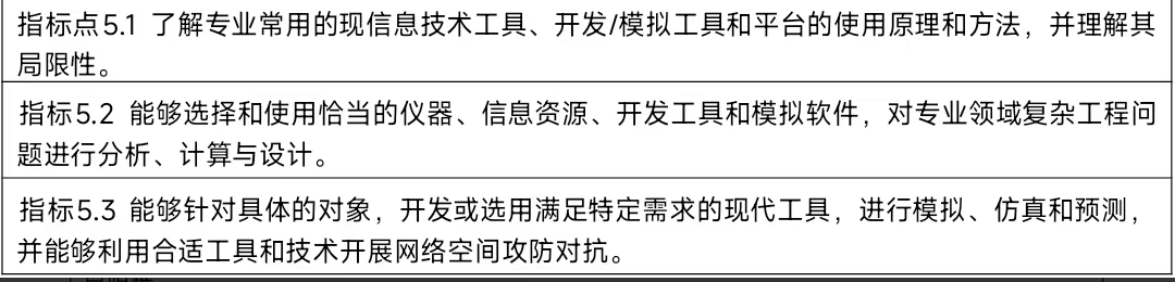 5.[使用现代工具]:能够针对网络空间安全工程领域复杂工程问题,开发、选择与使用恰当的技术、资源、现代工程工具和安全技术工具,实现对网络空间安全工程领域复杂工程问题的预测与模拟,熟悉网络空间攻防对抗的流程,并能够利用合适工具和技术开展网络空间攻防对抗。
