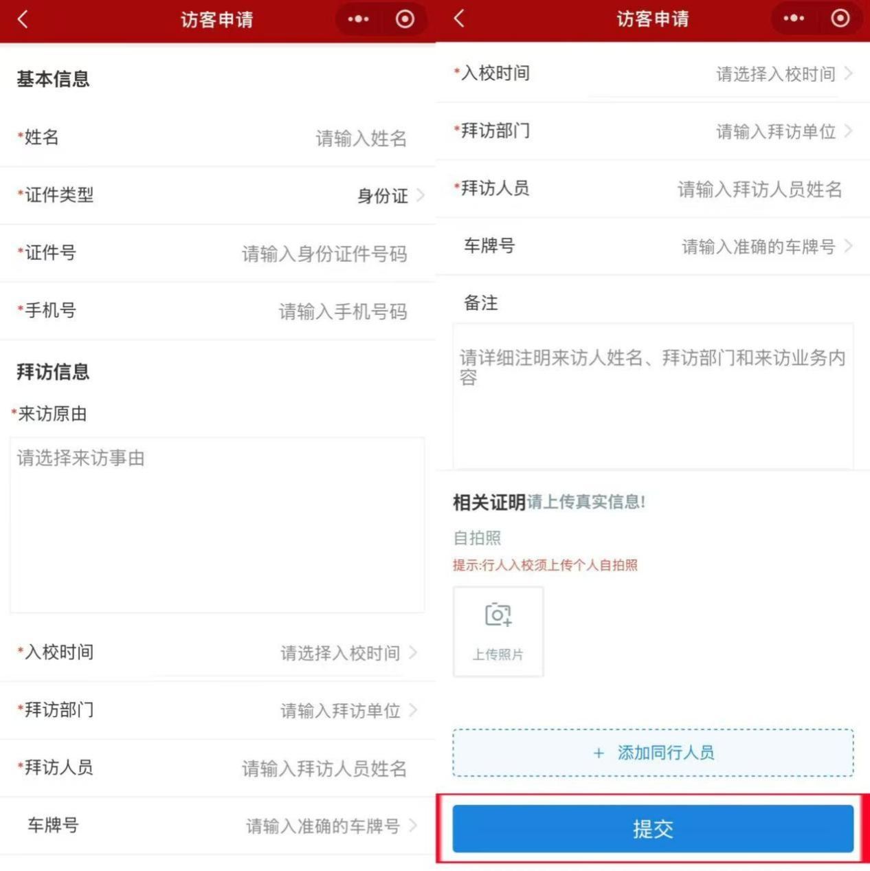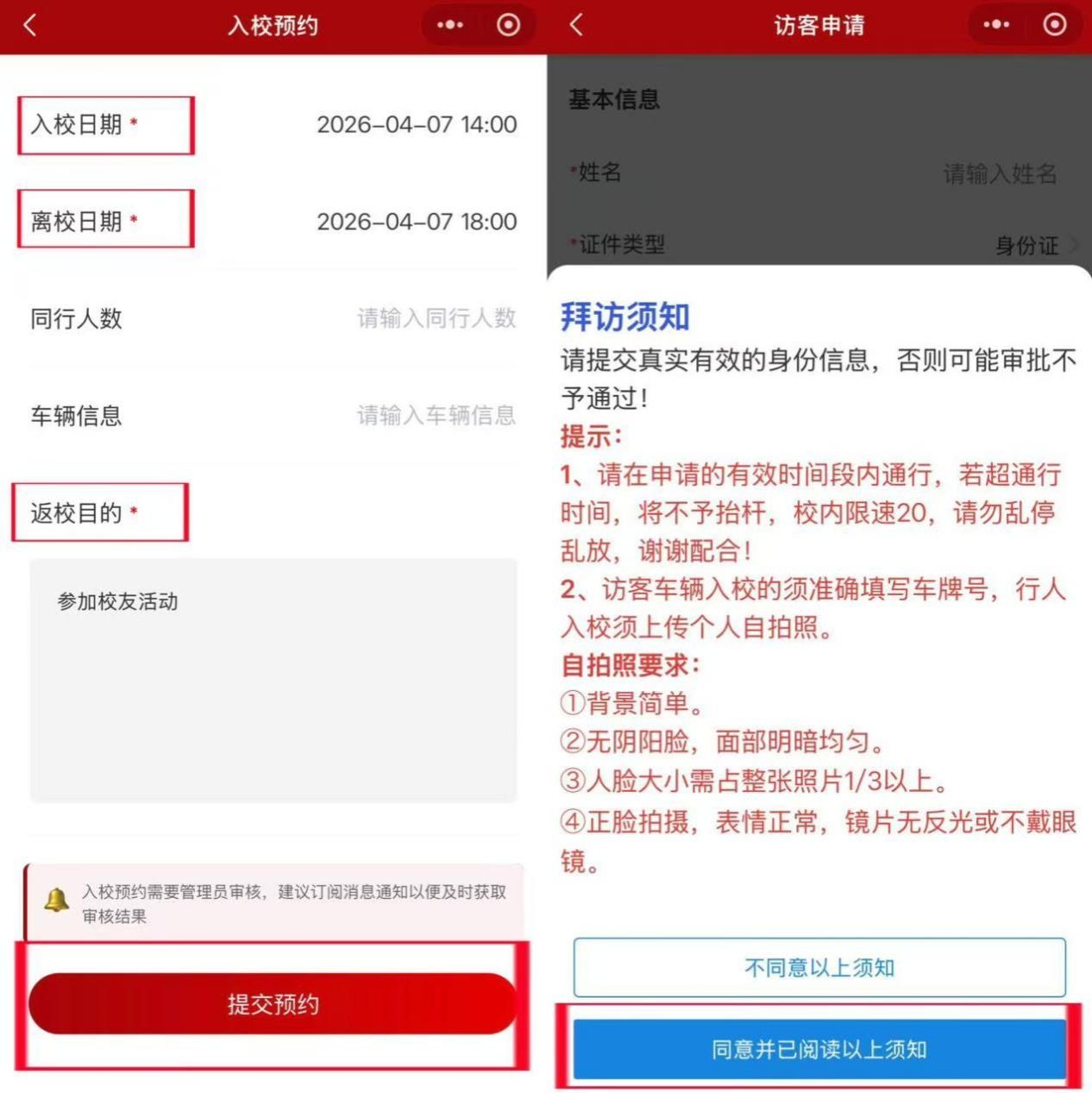 2.依次填写入校预约所需内容,完成后点击“提交预约”,进入“访客申请”界面,认真阅读“拜访须知”后点击“同意并已阅读以上须知”进行个人信息填写(注意标“*”为必填信息),填写完成划至页面底部点击“提交”等待管理员审核。