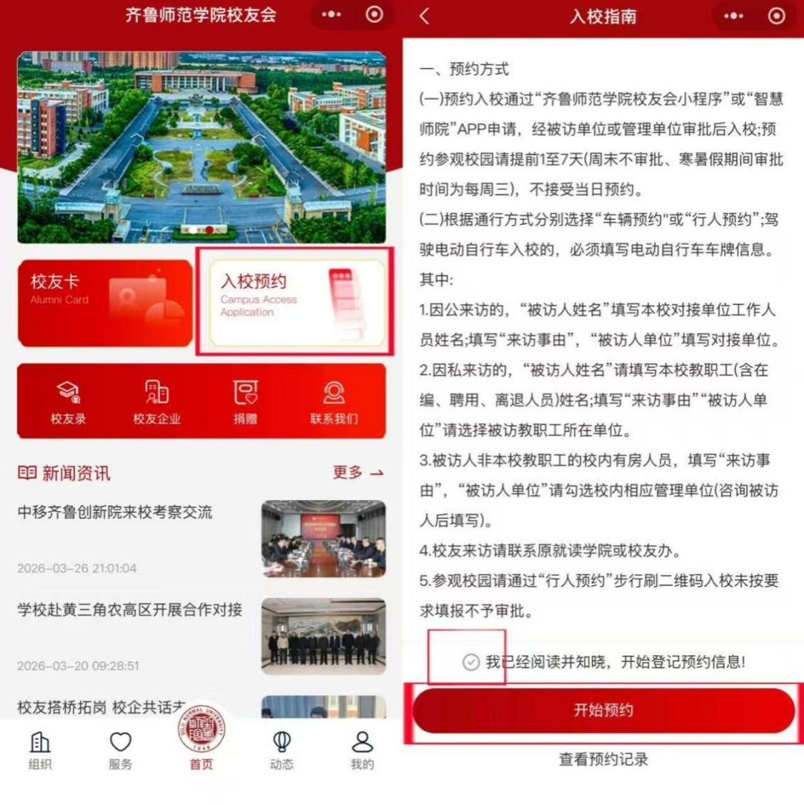 1. 在主页点击“入校预约”,进入右侧页面,点击“我已经阅读并知晓”圆圈及“开始预约”开始预约