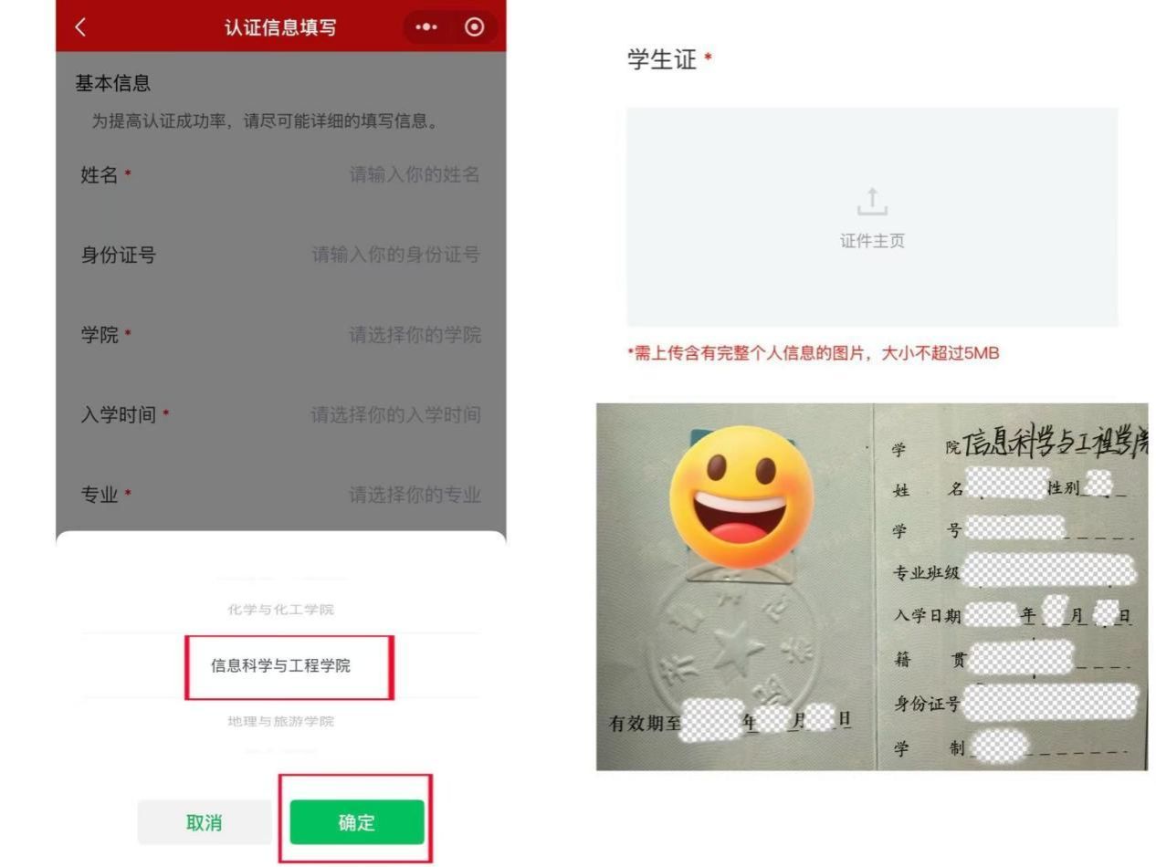 2.选择学院时,上下滑动找到自己所在学院,如下图中“信息科学与工程学院”,停留在该处,点击“确认”即选择成功。若上传学生证/毕业证,请上传下图学生证中含有完整个人信息的图片(毕业证同上)。