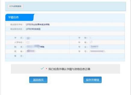 ( 6)查询后出现资格信息确认网址,仔细确认好自己的有关信息后,点击 “保存并继续”。然后再次确认保存。