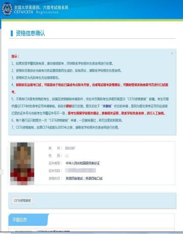 注意:报名资格确认在 3 月 17 日 9:00--3 月 18 日 16:00,考生需进行学籍信息和资格信息确认(包括检查照片和基本信息是否正确,查看报名资格科目)。请考生认真填写、核对本人信息并对所填报的各项信息负责。信息中如有生僻字可切换浏览器(推荐使用谷歌、火狐、IE9+)重试。如信息有误,考生可自行复核。如自行复核失败请于 3 月 18 日下午 16:00 之前以学院为单位联系教务处考试中心申请处理,