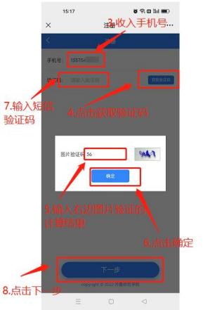 在注册页面输入手机号,点击“获取验证码”按钮,弹窗输入图片验证码计算结果,点击“确定”按钮,收到短信后输入短信验证码,点击下一步。完善相关资料,输入真实有效的姓名、身份证号、邮箱,设置登录密码,然后点击提交按钮。